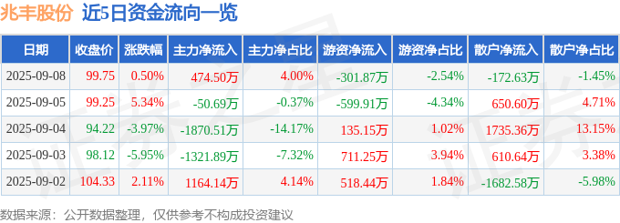 证券之星消息,截至2025年9月8日收盘,兆丰股份(300695)报收于99.75元,上涨0.5%,换手率1.16%,成交量1.19万手,成交额1.19亿元。