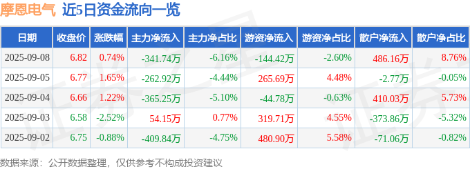 证券之星消息,截至2025年9月8日收盘,摩恩电气(002451)报收于6.82元,上涨0.74%,换手率1.86%,成交量8.15万手,成交额5551.17万元。