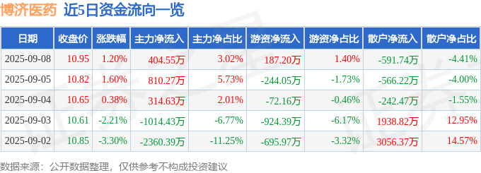 证券之星消息,截至2025年9月8日收盘,博济医药(300404)报收于10.95元,上涨1.2%,换手率4.39%,成交量12.33万手,成交额1.34亿元。