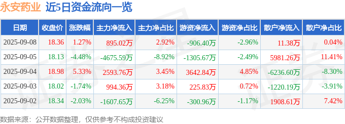 证券之星消息,截至2025年9月8日收盘,永安药业(002365)报收于18.36元,上涨1.27%,换手率6.78%,成交量16.66万手,成交额3.07亿元。
