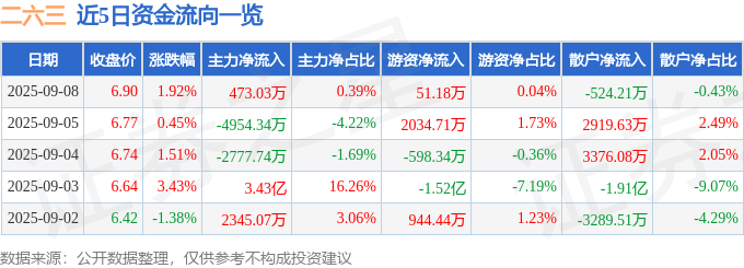 证券之星消息,截至2025年9月8日收盘,二六三(002467)报收于6.9元,上涨1.92%,换手率13.0%,成交量177.65万手,成交额12.12亿元。
