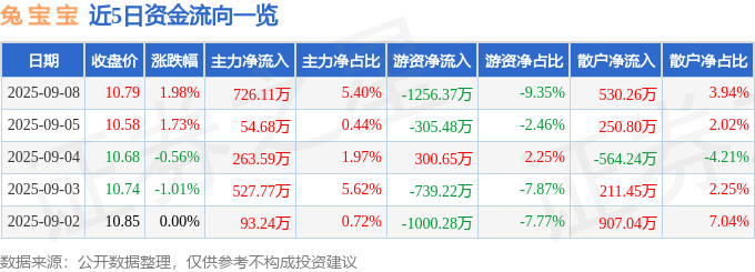 9月8日的资金流向数据方面,主力资金净流入726.11万元,占总成交额5.4%,游资资金净流出1256.37万元,占总成交额9.35%,散户资金净流入530.26万元,占总成交额3.94%。