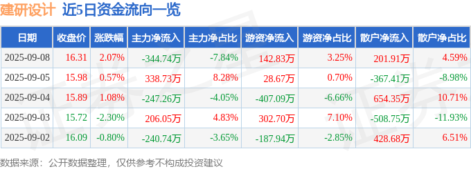 证券之星消息,截至2025年9月8日收盘,建研设计(301167)报收于16.31元,上涨2.07%,换手率3.82%,成交量2.72万手,成交额4397.38万元。