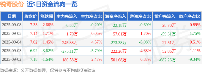 证券之星消息,截至2025年9月8日收盘,锐奇股份(300126)报收于7.33元,上涨2.66%,换手率2.11%,成交量4.45万手,成交额3218.73万元。