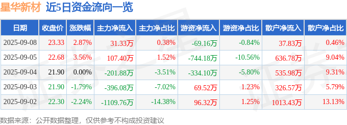 证券之星消息,截至2025年9月8日收盘,星华新材(301077)报收于23.33元,上涨2.87%,换手率3.75%,成交量3.58万手,成交额8257.81万元。