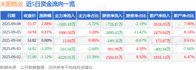 证券之星消息,截至2025年9月8日收盘,太阳纸业(002078)报收于15.37元,上涨2.88%,换手率0.78%,成交量21.8万手,成交额3.33亿元。