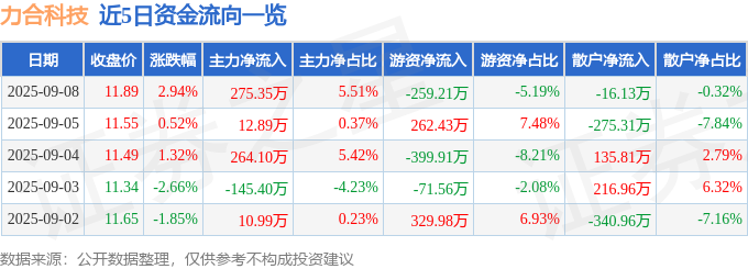 9月8日的资金流向数据方面,主力资金净流入275.35万元,占总成交额5.51%,游资资金净流出259.21万元,占总成交额5.19%,散户资金净流出16.13万元,占总成交额0.32%。