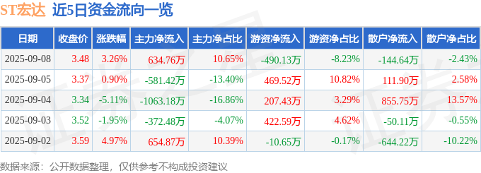 证券之星消息,截至2025年9月8日收盘,ST宏达(002211)报收于3.48元,上涨3.26%,换手率3.98%,成交量17.21万手,成交额5958.05万元。