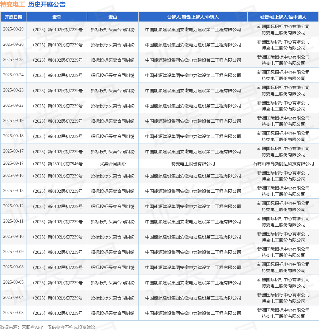 案号:(2025)新0102民初7239号根据统计,近一年内以特变电工股份有限公司为当事人的历史开庭公告有39则,其中案由为“招标投标买卖合同纠纷”的公告以29则居首,其次为“买卖合同纠纷”有3则,“提供劳务者受害责任纠纷”有2则。历史开庭公告(前20条)如下: