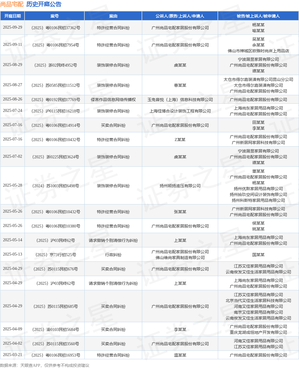 案号:(2025)粤0106民初7954号根据统计,近一年内以广州尚品宅配家居股份有限公司为当事人的历史开庭公告有45则,其中案由为“买卖合同纠纷”的公告以15则居首,其次为“装饰装修合同纠纷”有15则,“特许经营合同纠纷”有8则。历史开庭公告(前20条)如下: