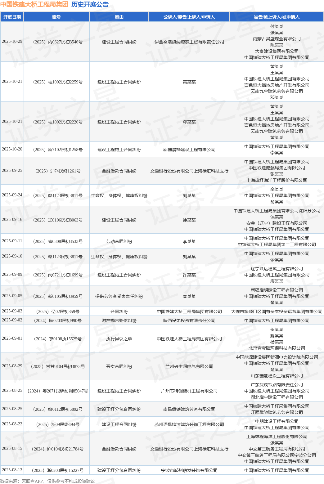 案号:(2025)粤0308民初3533号根据统计,近一年内以中国铁建大桥工程局集团有限公司为当事人的历史开庭公告有233则,其中案由为“建设工程施工合同纠纷”的公告以40则居首,其次为“买卖合同纠纷”有34则,“劳务合同纠纷”有17则。历史开庭公告(前20条)如下: