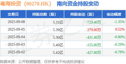 证券之星消息,9月8日南向资金减持729.4万股粤海投资(00270.HK)。近5个交易日中,获南向资金减持的有4天,累计净减持1464.6万股。近20个交易日中,获南向资金减持的有10天,累计净减持1909.19万股。截至目前,南向资金持有粤海投资(00270.HK)5.31亿股,占公司已发行普通股的8.11%。