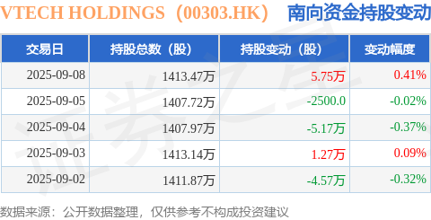 证券之星消息,9月8日南向资金增持5.75万股VTECH HOLDINGS(00303.HK)。近5个交易日中,获南向资金减持的有3天,累计净减持2.97万股。近20个交易日中,获南向资金增持的有13天,累计净增持71.61万股。截至目前,南向资金持有VTECH HOLDINGS(00303.HK)1413.47万股,占公司已发行普通股的5.58%。