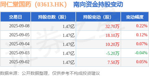 证券之星消息,9月8日南向资金增持32.7万股同仁堂国药(03613.HK)。近5个交易日中,获南向资金增持的有4天,累计净增持63.3万股。近20个交易日中,获南向资金增持的有13天,累计净增持178.7万股。截至目前,南向资金持有同仁堂国药(03613.HK)1.47亿股,占公司已发行普通股的17.6%。