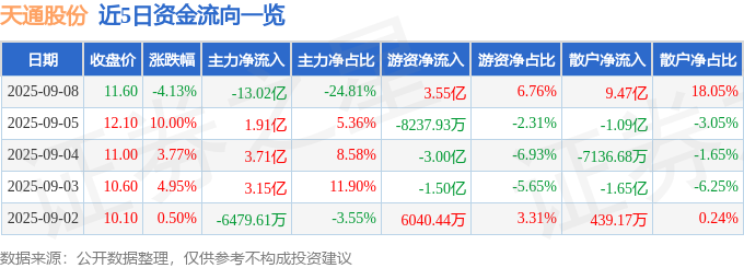 证券之星消息,截至2025年9月8日收盘,天通股份(600330)报收于11.6元,下跌4.13%,换手率34.16%,成交量421.31万手,成交额52.47亿元。
