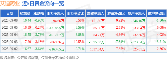 证券之星消息,截至2025年9月8日收盘,艾迪药业(688488)报收于16.44元,下跌0.9%,换手率2.35%,成交量9.9万手,成交额1.64亿元。