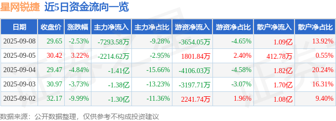 证券之星消息,截至2025年9月8日收盘,星网锐捷(002396)报收于29.65元,下跌2.53%,换手率4.54%,成交量26.48万手,成交额7.86亿元。