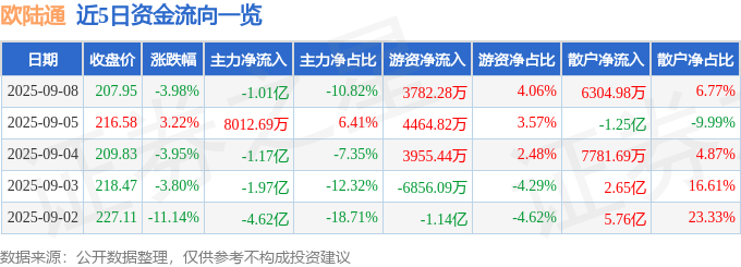 证券之星消息,截至2025年9月8日收盘,欧陆通(300870)报收于207.95元,下跌3.98%,换手率4.07%,成交量4.46万手,成交额9.32亿元。