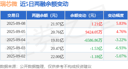 证券之星消息,9月8日,瑞芯微(603893)融资买入4.49亿元,融资偿还3.27亿元,融资净买入1.21亿元,融资余额21.81亿元,近20个交易日中有15个交易日出现融资净买入。
