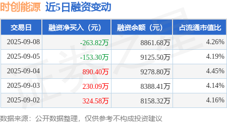 证券之星消息,9月8日,时创能源(688429)融资买入1379.46万元,融资偿还1643.27万元,融资净卖出263.82万元,融资余额8861.68万元。