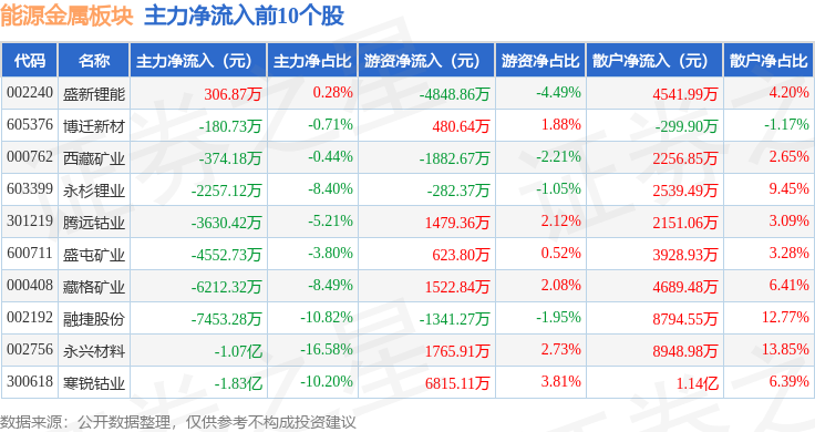 从资金流向上来看,当日能源金属板块主力资金净流出16.29亿元,游资资金净流入3.96亿元,散户资金净流入12.34亿元。能源金属板块个股资金流向见下表: