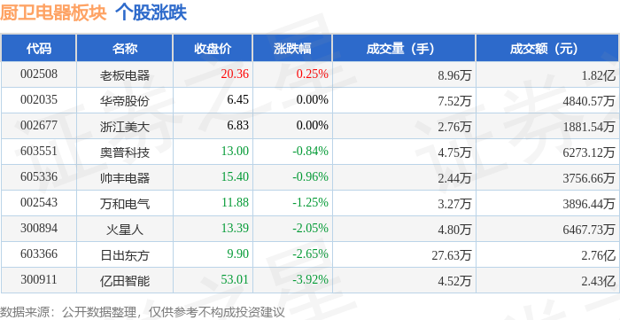 证券之星消息,9月9日厨卫电器板块较上一交易日下跌1.21%,亿田智能领跌。当日上证指数报收于3807.29,下跌0.51%。深证成指报收于12510.6,下跌1.23%。厨卫电器板块个股涨跌见下表: