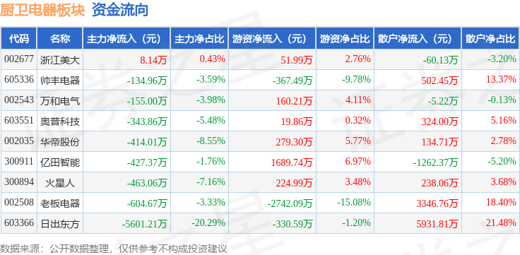 从资金流向上来看,当日厨卫电器板块主力资金净流出8135.99万元,游资资金净流出1014.07万元,散户资金净流入9150.07万元。厨卫电器板块个股资金流向见下表: