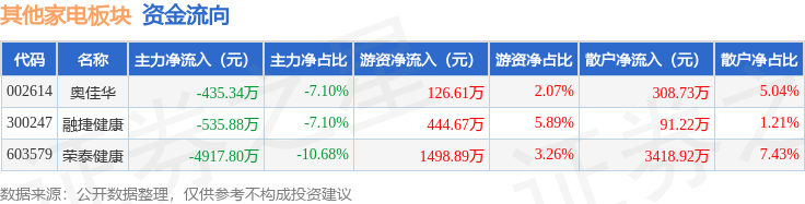 从资金流向上来看,当日其他家电板块主力资金净流出5889.03万元,游资资金净流入2070.16万元,散户资金净流入3818.87万元。其他家电板块个股资金流向见下表: