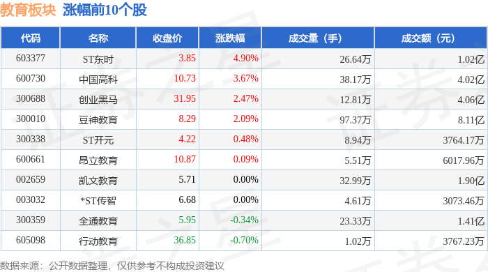 证券之星消息,9月9日教育板块较上一交易日下跌0.14%,科德教育领跌。当日上证指数报收于3807.29,下跌0.51%。深证成指报收于12510.6,下跌1.23%。教育板块个股涨跌见下表: