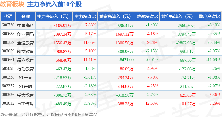 从资金流向上来看,当日教育板块主力资金净流出1.19亿元,游资资金净流入7551.06万元,散户资金净流入4393.71万元。教育板块个股资金流向见下表: