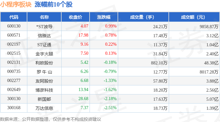 证券之星消息,9月9日小程序板块较上一交易日下跌1.72%,信息发展领跌。当日上证指数报收于3807.29,下跌0.51%。深证成指报收于12510.6,下跌1.23%。小程序板块个股涨跌见下表: