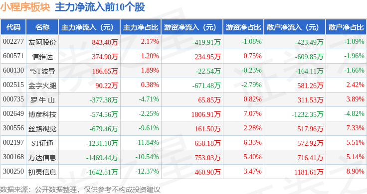从资金流向上来看,当日小程序板块主力资金净流出4.95亿元,游资资金净流入4773.8万元,散户资金净流入4.47亿元。小程序板块个股资金流向见下表: