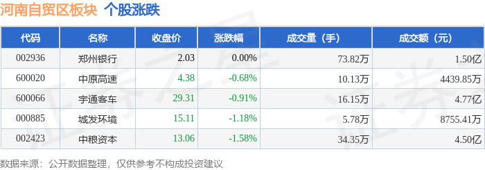 证券之星消息,9月9日河南自贸区板块较上一交易日下跌0.98%,中粮资本领跌。当日上证指数报收于3807.29,下跌0.51%。深证成指报收于12510.6,下跌1.23%。河南自贸区板块个股涨跌见下表: