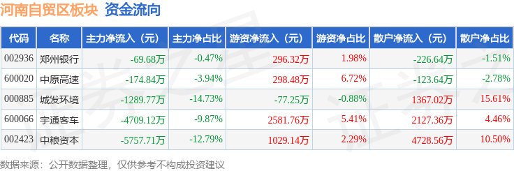 从资金流向上来看,当日河南自贸区板块主力资金净流出1.2亿元,游资资金净流入4128.46万元,散户资金净流入7872.66万元。河南自贸区板块个股资金流向见下表: