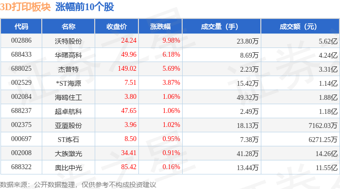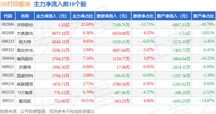 从资金流向上来看,当日3D打印板块主力资金净流出15.07亿元,游资资金净流入4.44亿元,散户资金净流入10.63亿元。3D打印板块个股资金流向见下表: