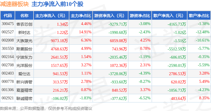 从资金流向上来看,当日减速器板块主力资金净流出11.98亿元,游资资金净流入2.19亿元,散户资金净流入9.79亿元。减速器板块个股资金流向见下表: