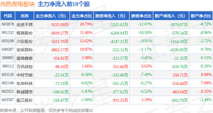 从资金流向上来看,当日光热发电板块主力资金净流出2.7亿元,游资资金净流出1.5亿元,散户资金净流入4.2亿元。光热发电板块个股资金流向见下表: