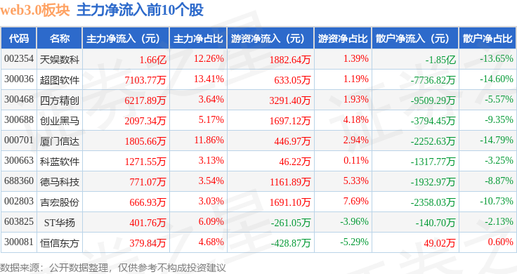 从资金流向上来看,当日web3.0板块主力资金净流出6.82亿元,游资资金净流入4.43亿元,散户资金净流入2.39亿元。web3.0板块个股资金流向见下表: