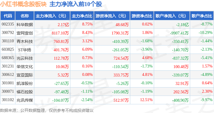 从资金流向上来看,当日小红书概念股板块主力资金净流出5.29亿元,游资资金净流出1.05亿元,散户资金净流入6.35亿元。小红书概念股板块个股资金流向见下表: