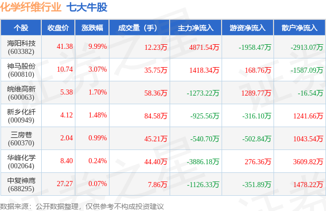 个股表现方面,化学纤维行业当日领涨股为海阳科技(603382),该股当日报收41.38,上涨9.99%,成交量12.23万,主力资金净流入4871.54万元。神马股份(600810)以上涨3.07%紧随其后,该股当日成交量35.75万,主力资金净流入1418.34万元。除此之外,皖维高新(600063)、新乡化纤(000949)、三房巷(600370)均进入当日牛股之列。具体个股列表见下表: