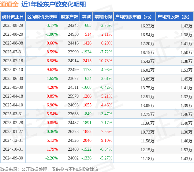从股价来看,2025年8月20日至2025年8月29日,道道全区间跌幅为3.17%,在此期间股东户数减少685.0户,减幅为2.75%。