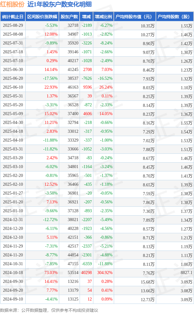从股价来看,2025年8月8日至2025年8月29日,红相股份区间跌幅为5.53%,在此期间股东户数减少2189.0户,减幅为6.27%。