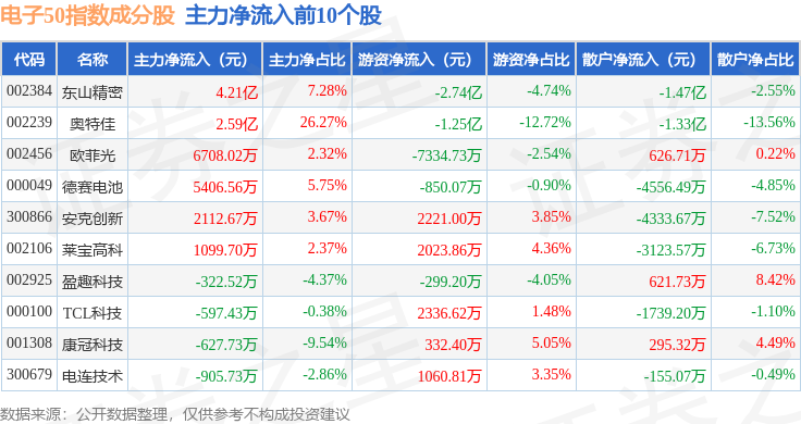 资金流向方面,电子50(399281)指数成份股当日主力资金净流出合计50.88亿元,游资资金净流入合计8.84亿元,散户资金净流入合计42.03亿元。成份股资金流向详情见下表: