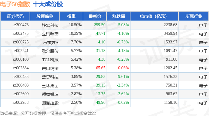 证券之星消息,9月9日,电子50(399281)指数报收于4161.38点,跌2.86%,成交832.48亿元,换手率2.85%。当日该指数成份股中,上涨的有5家,奥特佳以10.03%的涨幅领涨,下跌的有45家,精研科技以11.54%的跌幅领跌。