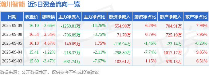 9月9日的资金流向数据方面,主力资金净流出1259.81万元,占总成交额14.26%,游资资金净流入554.9万元,占总成交额6.28%,散户资金净流入704.91万元,占总成交额7.98%。
