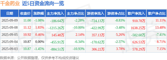 证券之星消息,截至2025年9月9日收盘,千金药业(600479)报收于11.0元,下跌1.08%,换手率1.77%,成交量7.41万手,成交额8198.88万元。