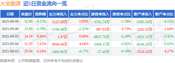 证券之星消息,截至2025年9月9日收盘,大全能源(688303)报收于32.9元,下跌0.57%,换手率1.23%,成交量26.37万手,成交额8.64亿元。