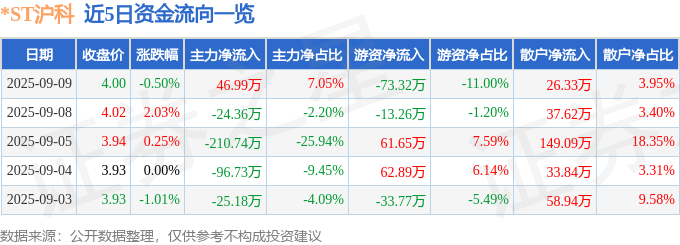 证券之星消息,截至2025年9月9日收盘,*ST沪科(600608)报收于4.0元,下跌0.5%,换手率0.52%,成交量1.65万手,成交额666.59万元。