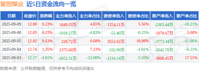 证券之星消息,截至2025年9月9日收盘,晋控煤业(601001)报收于12.88元,上涨0.23%,换手率1.04%,成交量17.47万手,成交额2.26亿元。