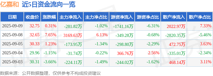 9月9日的资金流向数据方面,主力资金净流出281.82万元,占总成交额1.02%,游资资金净流出1741.16万元,占总成交额6.31%,散户资金净流入2022.97万元,占总成交额7.33%。